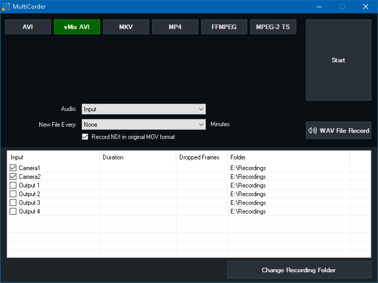 All available Camera, NDI inputs are listed within the MultiCorder window along with the four Output channels. Tick the source you wish to record and click Start.